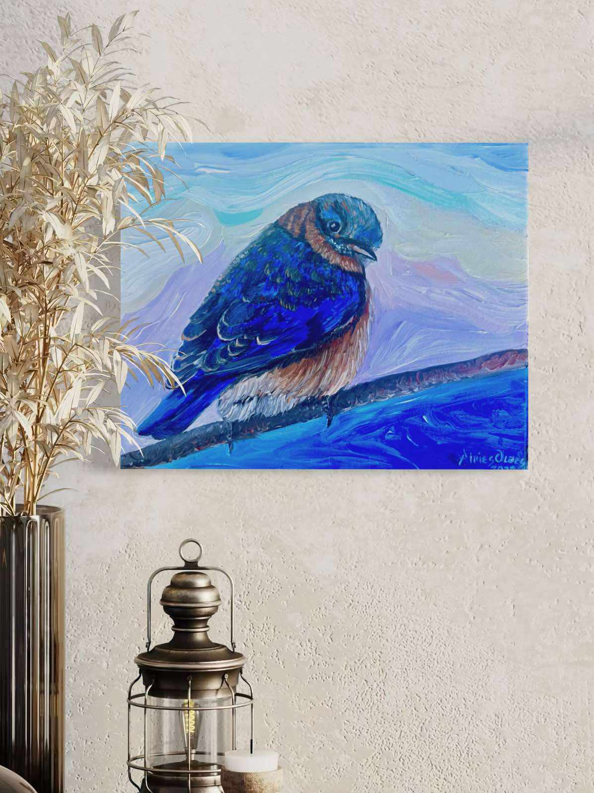The canvas is stretched around a hardwood frame and is 0.5” thick, It can be hung on the wall with or without a special frame. It comes with 2 pcs screw eye & string for hanging. Ready to ship.