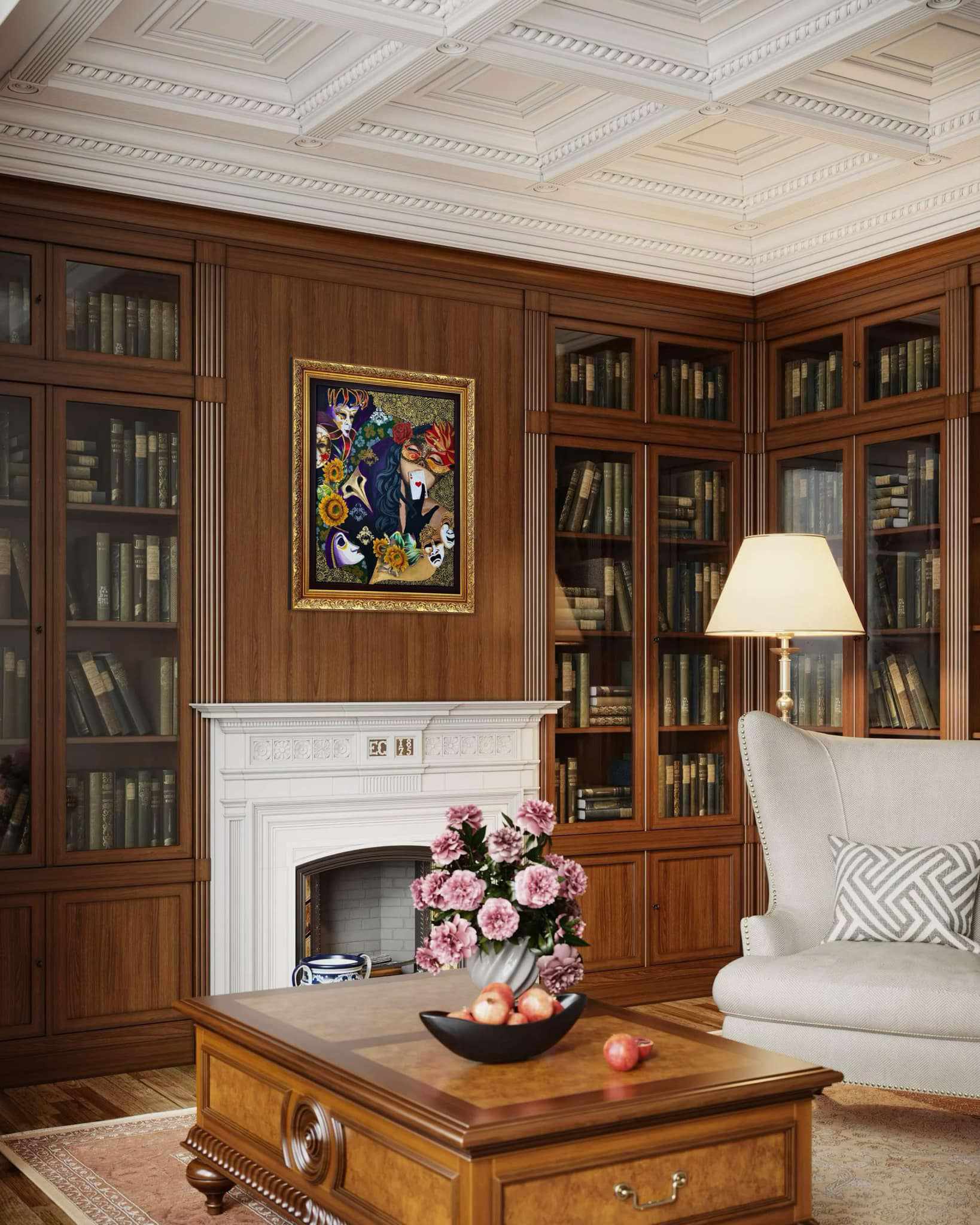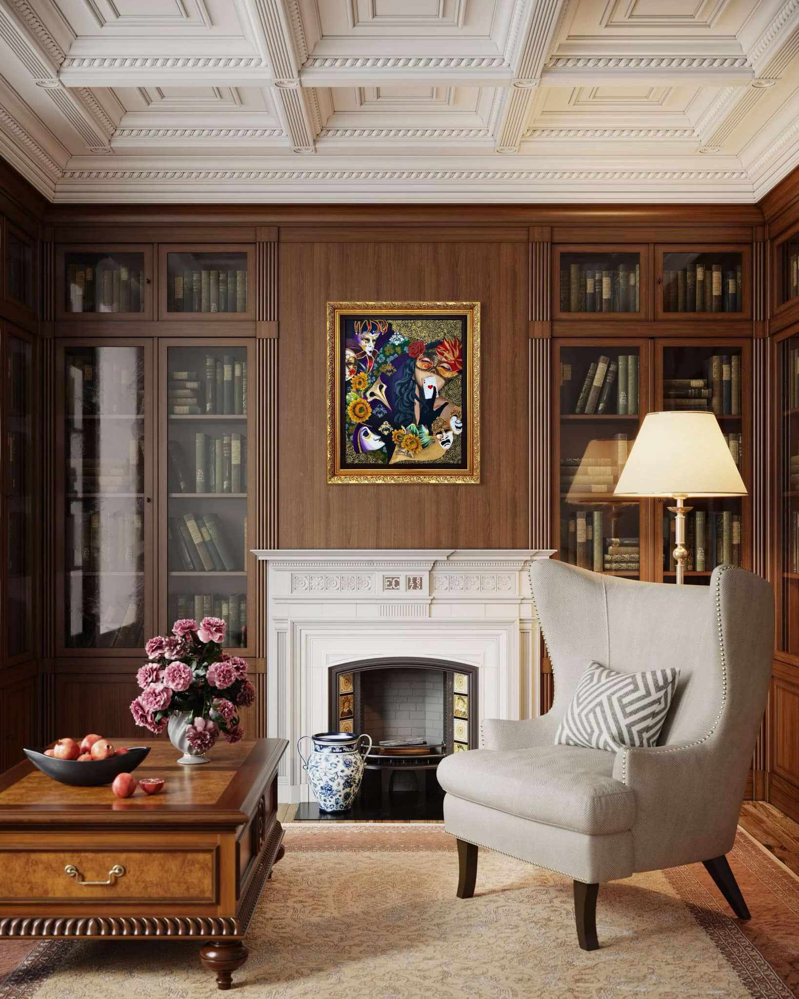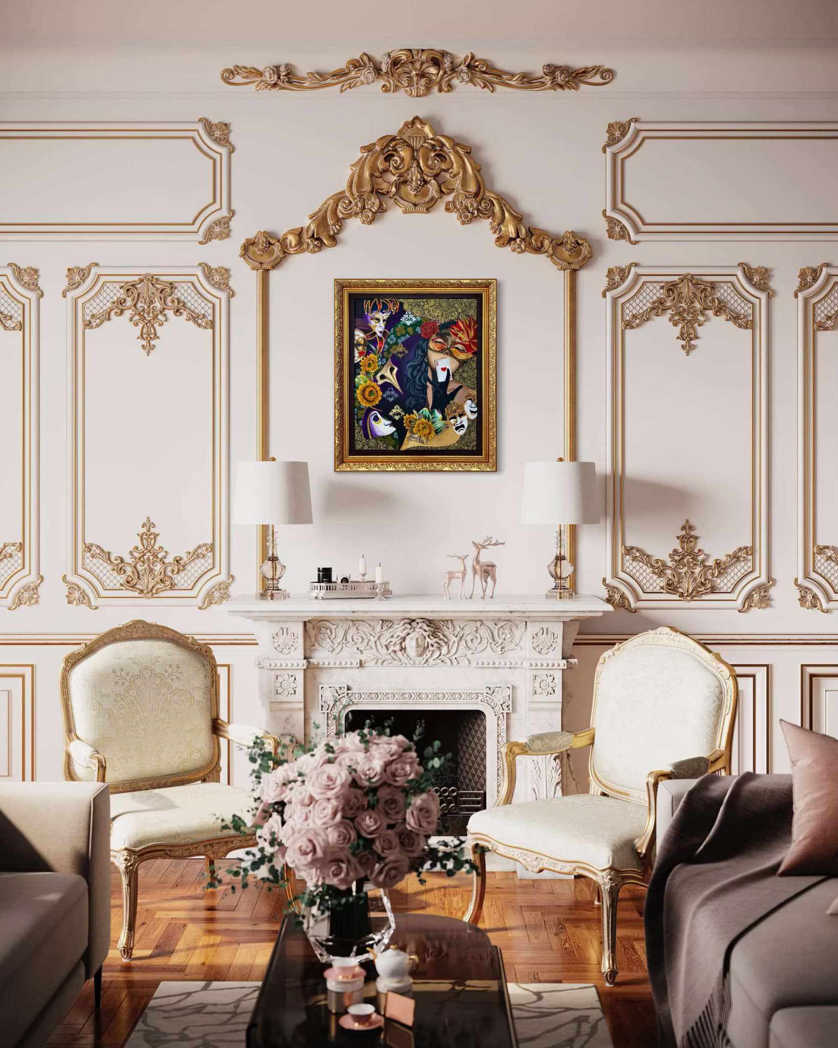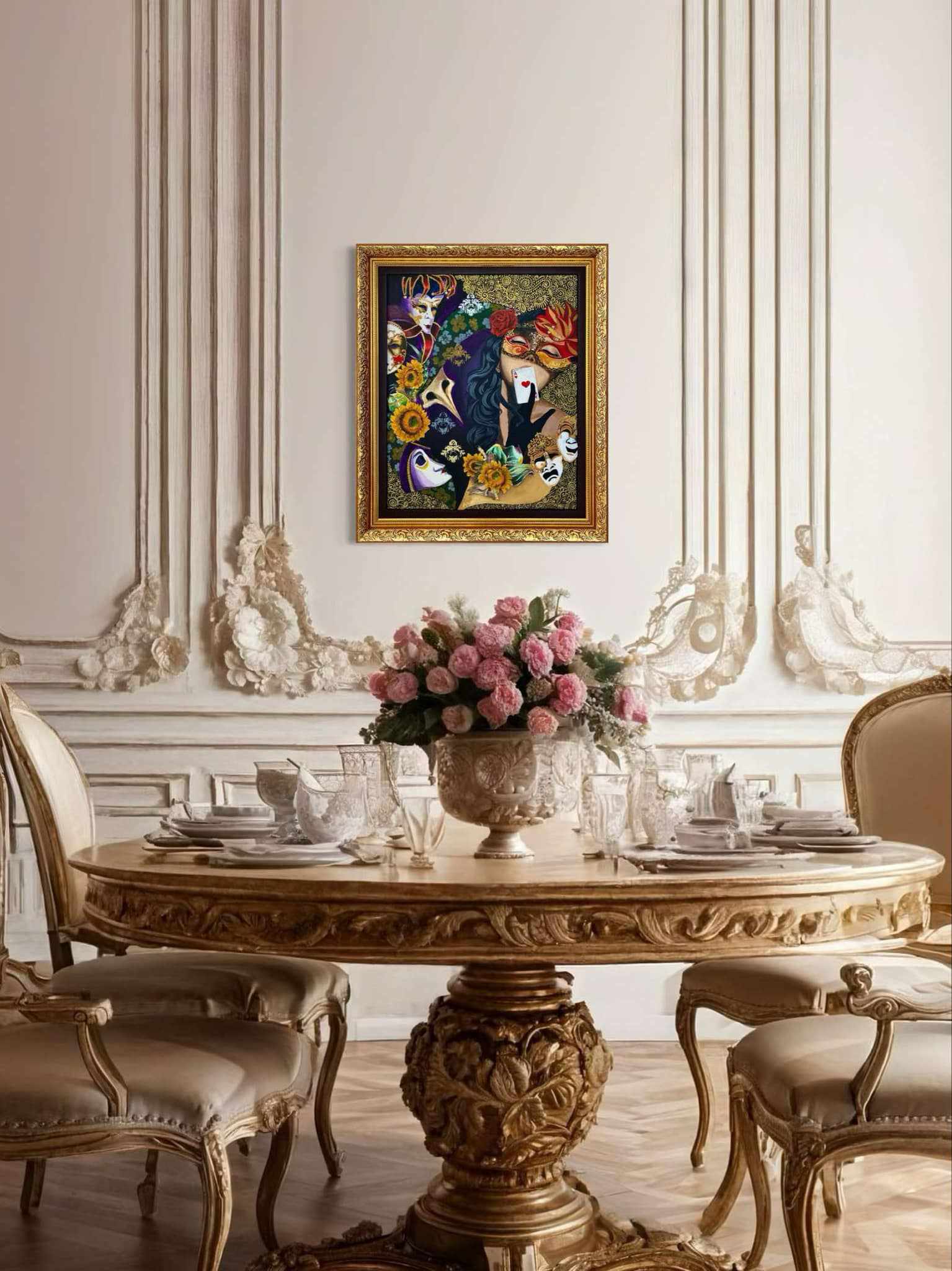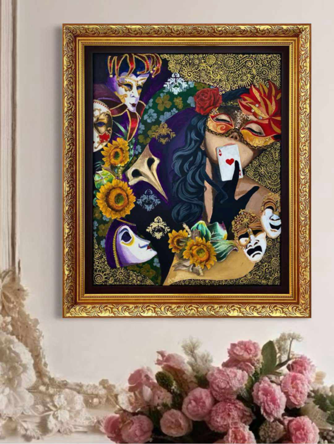 The canvas is stretched around a hardwood frame and is 0.75” thick, Ready to hang, and ready to ship.