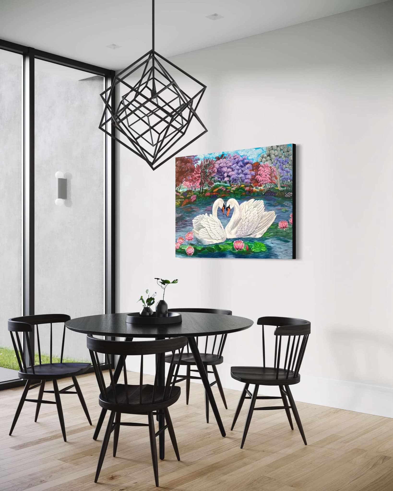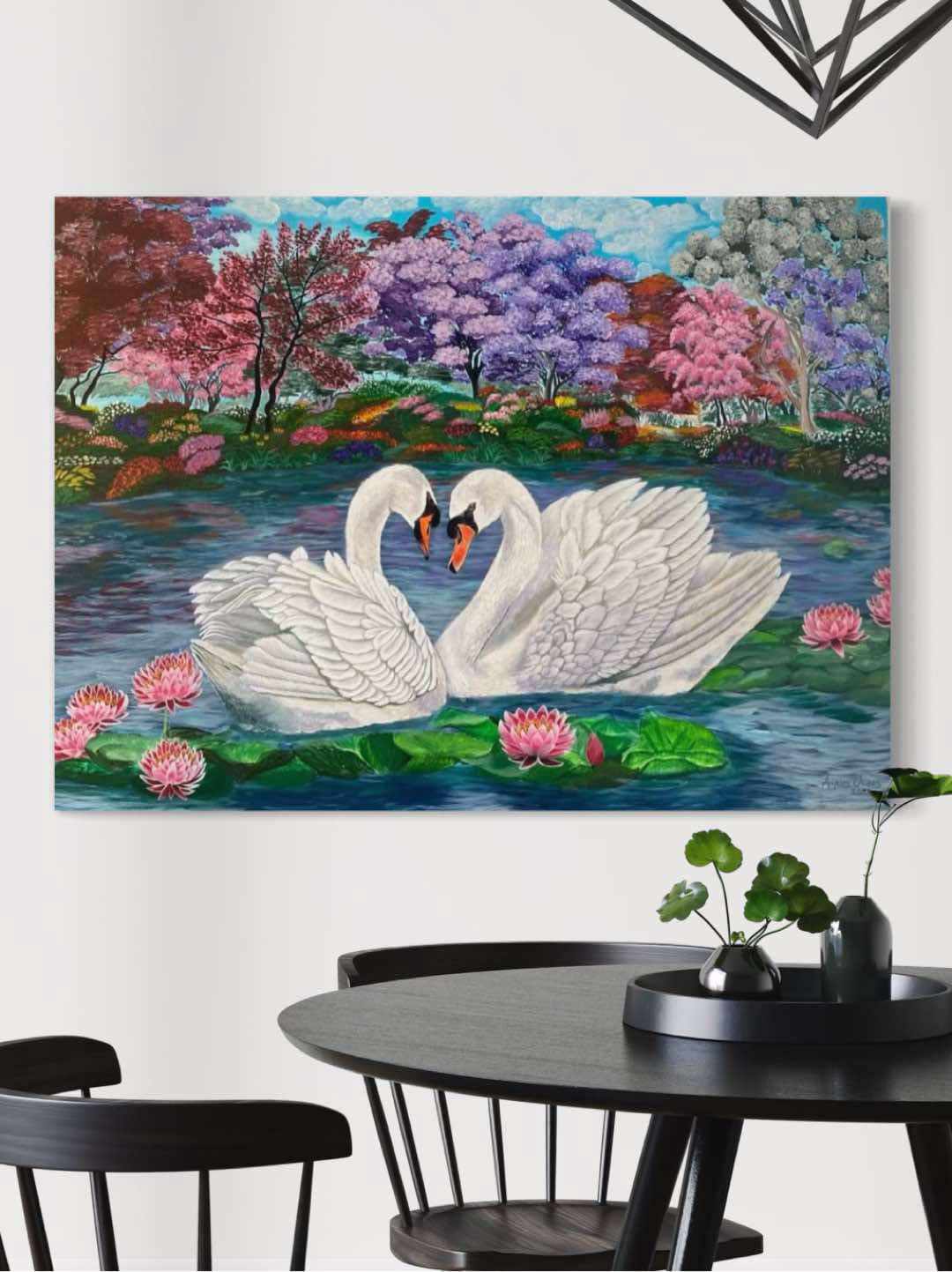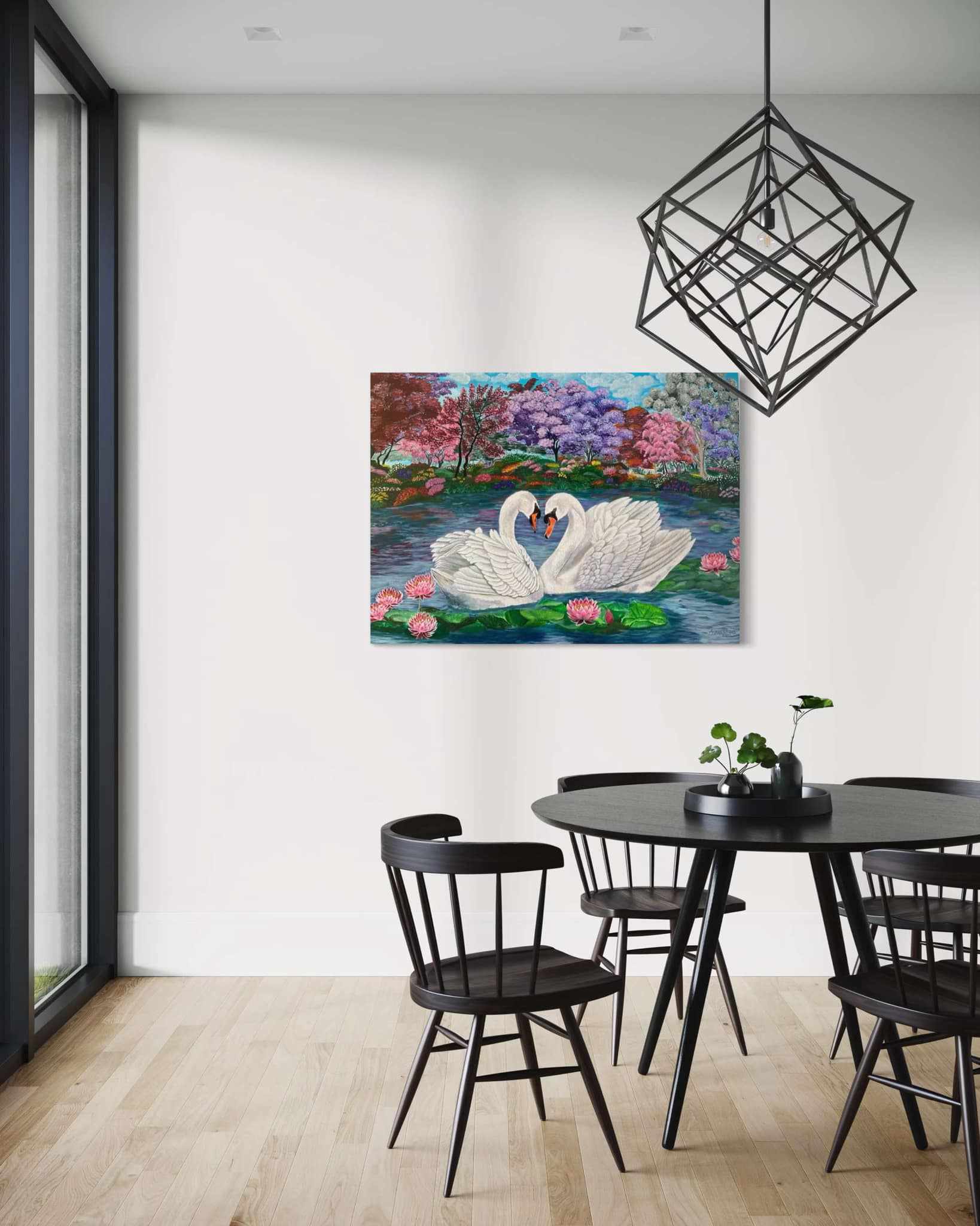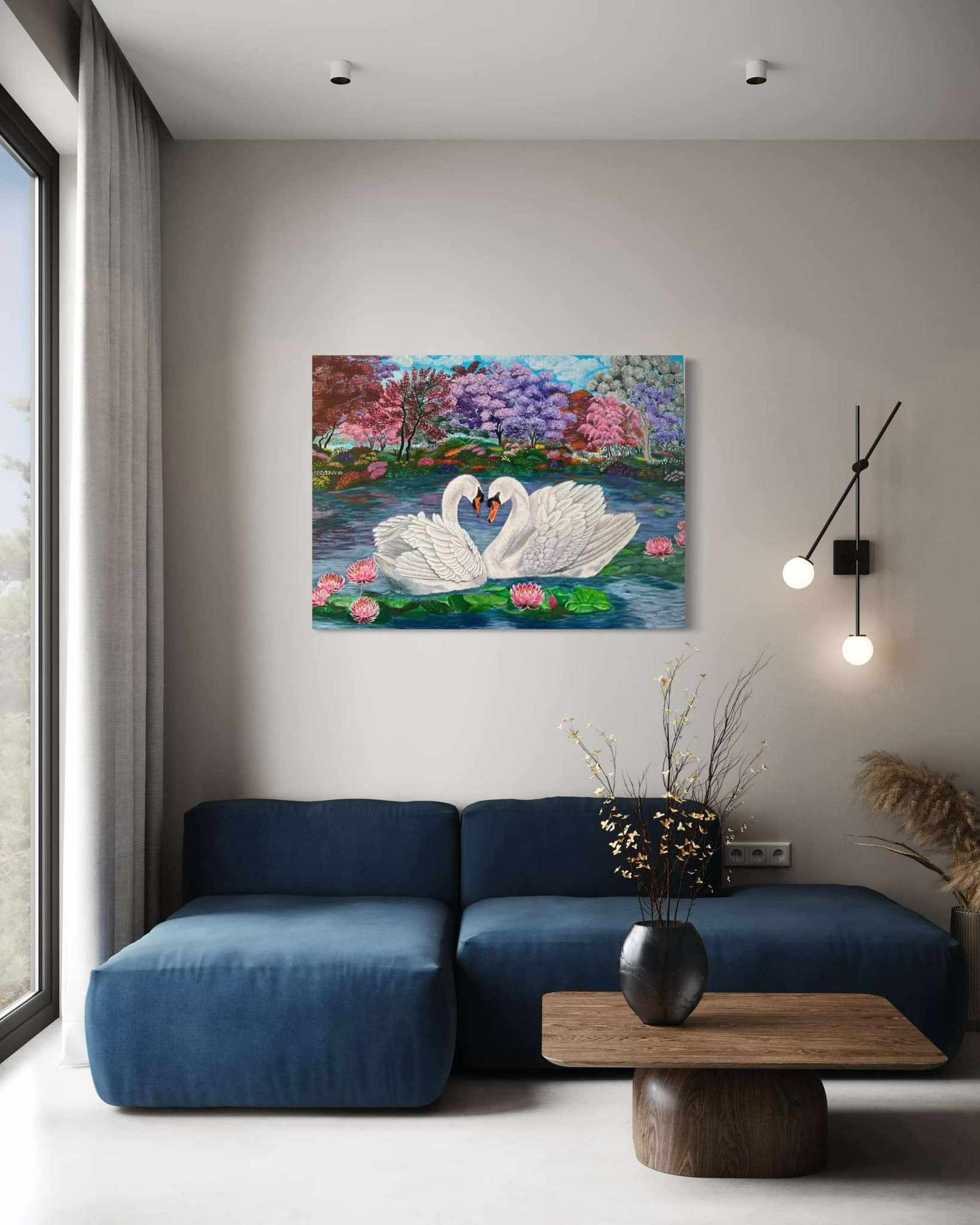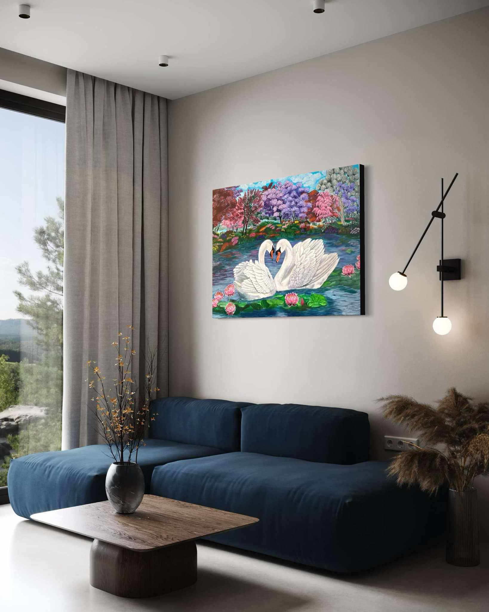A painting of a swan couple, The symbolism of love and devotion First and foremost, the swans represent love. They mate for life and are “lovebirds” in the true sense of the word. Once a couple of swans mate, they stay together all their lives, raising clutches of cygnets year after year.